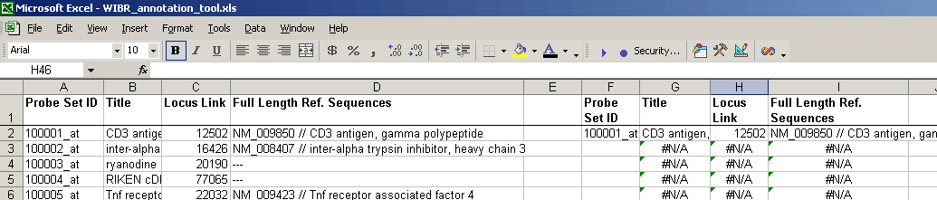 All of the #N/A will remain until probe set IDs are pasted into the input column.