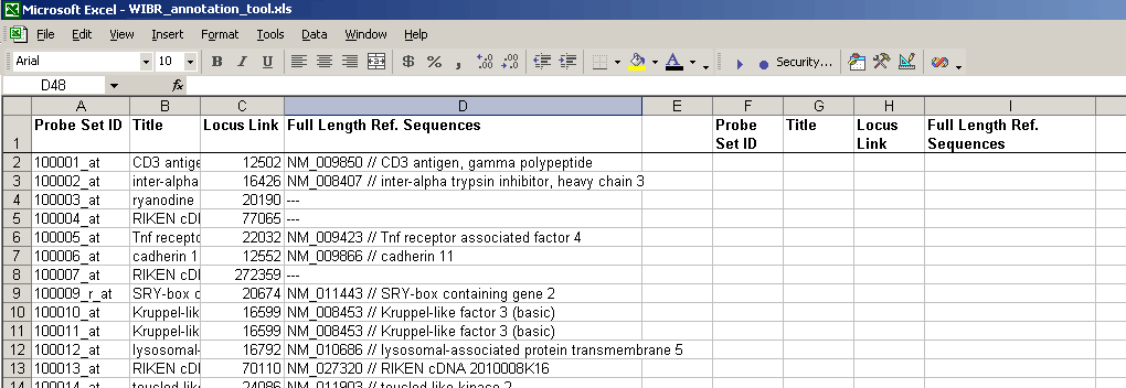 - The idea is that you'll paste a list of probes in the "Probe set ID" column on the right, and Excel will fill in the rest of the columns for those probes.