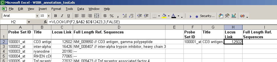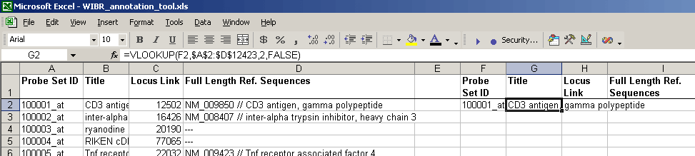 - In the second cell to the right of the probe ID (input data) column (F2 above), enter a similar formula, replacing colNum: