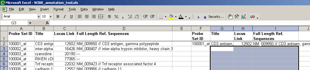 In the example, cells G2, H2, and I2 were pasted into rows 3 - 101 (if my probe ID lists were as long as 100 entries)